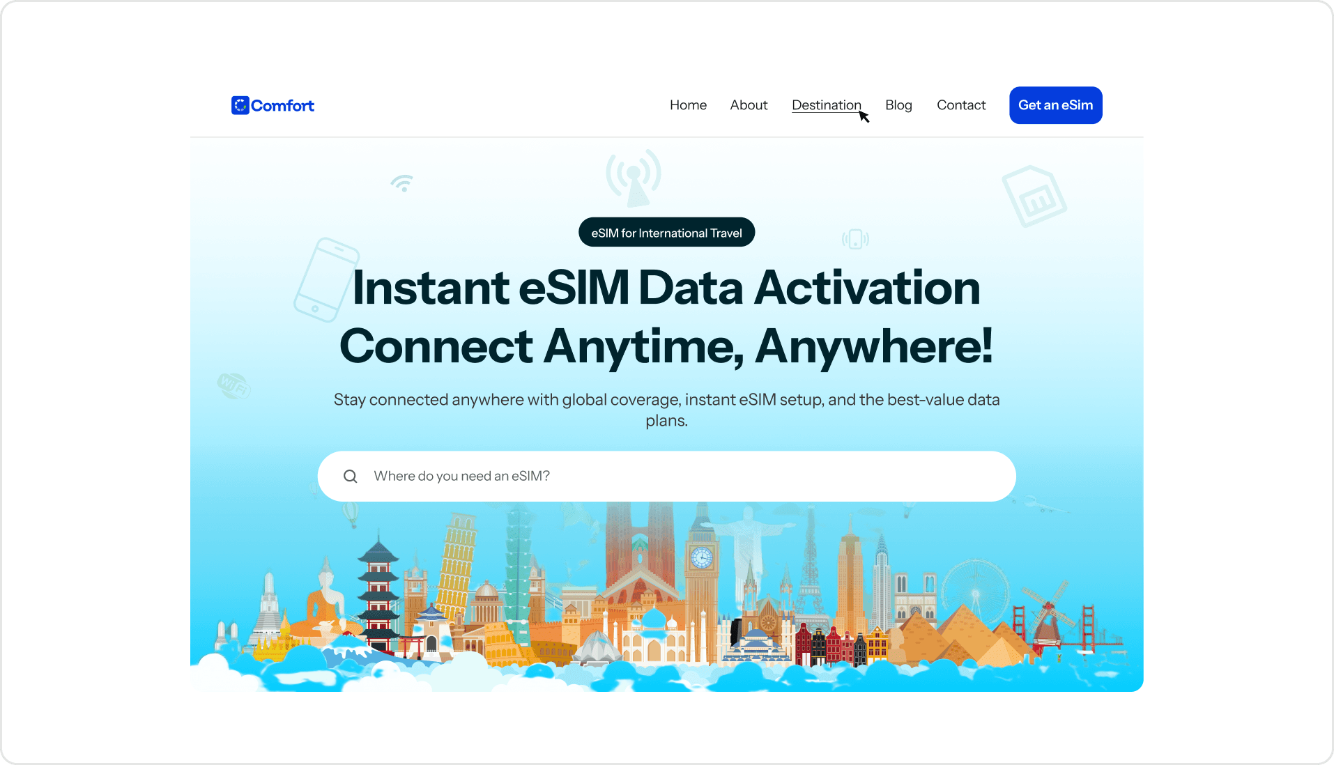 I was contracted to redesign the landing page for Comfort, an eSIM provider serving travelers in 150+ countries. The goal was to create a modern design to clearly communicate their value proposition, increase clickthrough, reduce bounce rate and improve conversion rate.