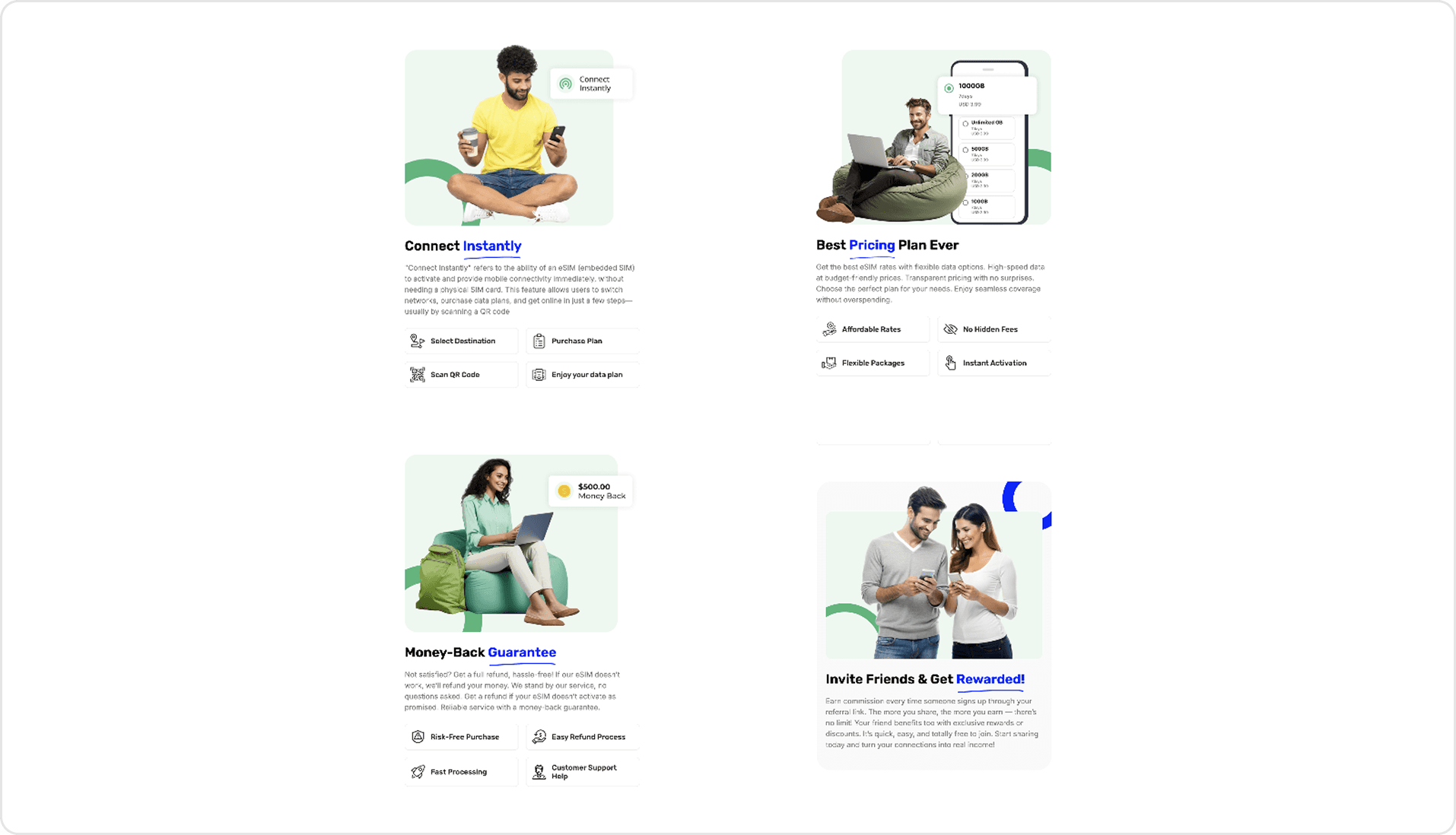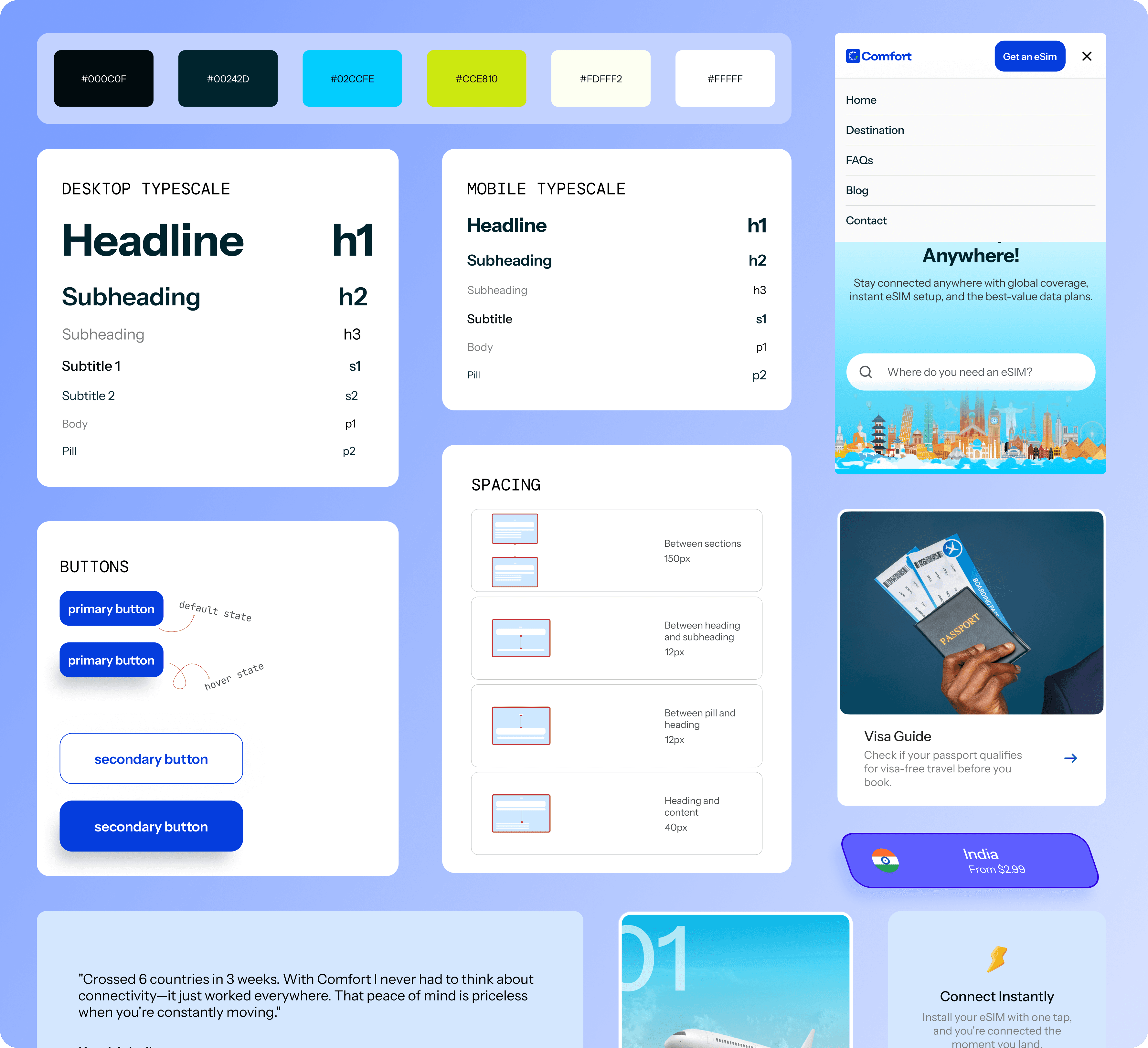 I gained deep knowledge of eSIM technology and its user education needs, learned to balance dense information with clean visual hierarchy, and discovered how trust signals drive purchase confidence in travel tech products.
