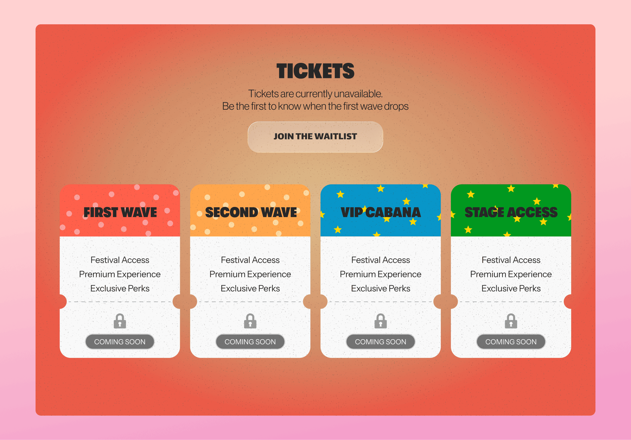Visually distinct ticket cards with illustrative elements made each tier clear, showcasing pricing, benefits, and availability while enabling easy comparison between General Admission, VIP, and VVIP—each with bold CTAs for immediate purchase.