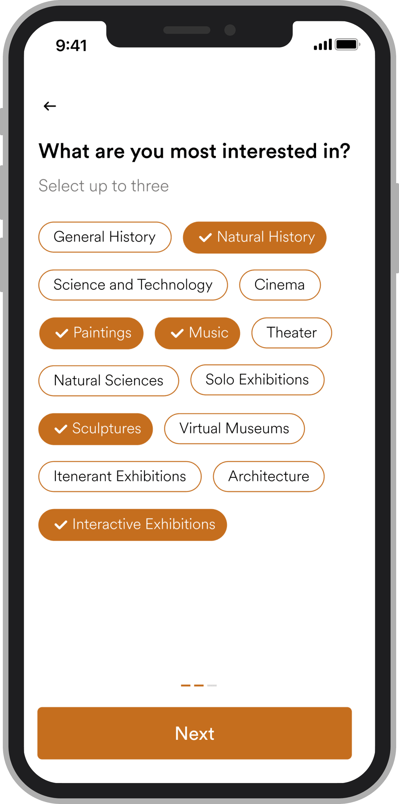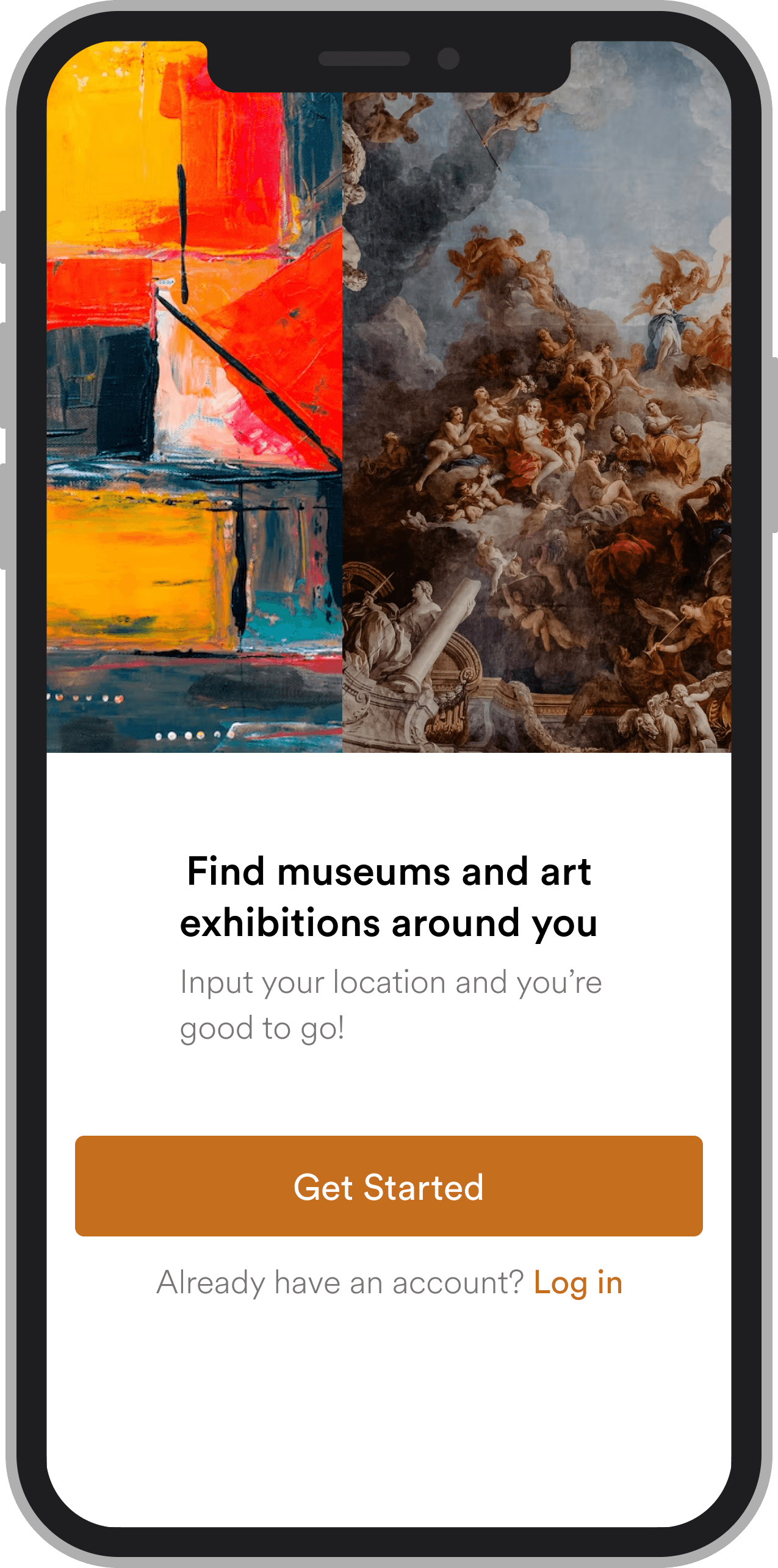 The onboarding experience sets the tone immediately. Users are welcomed with rich imagery of artwork to build anticipation, then prompted to select their interests and share their location. This upfront personalization means the app is already tailored to them before they reach the home screen.
