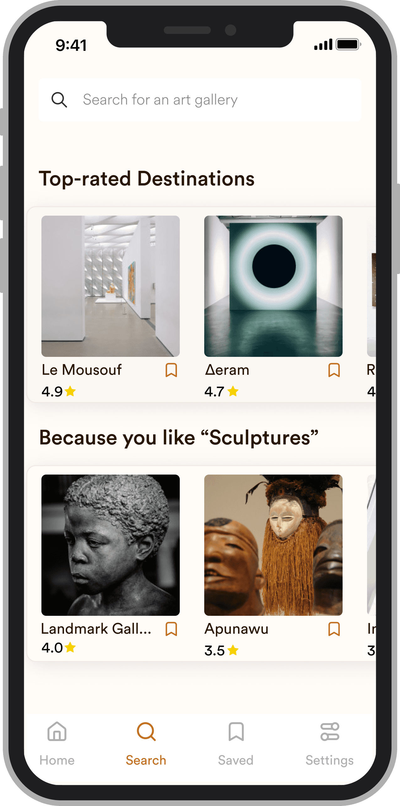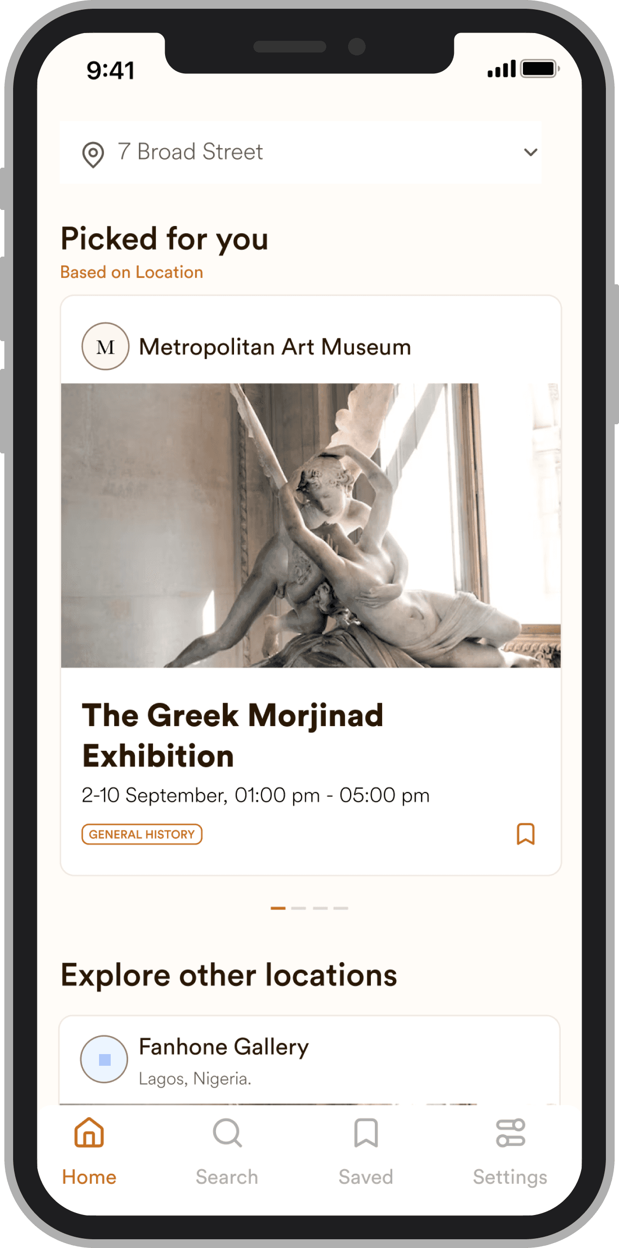 The home screen surfaces museums and galleries recommended based on the user's location and selected interests, displayed in a carousel format for easy browsing. Users can also explore beyond their immediate area by switching locations directly from the home screen.