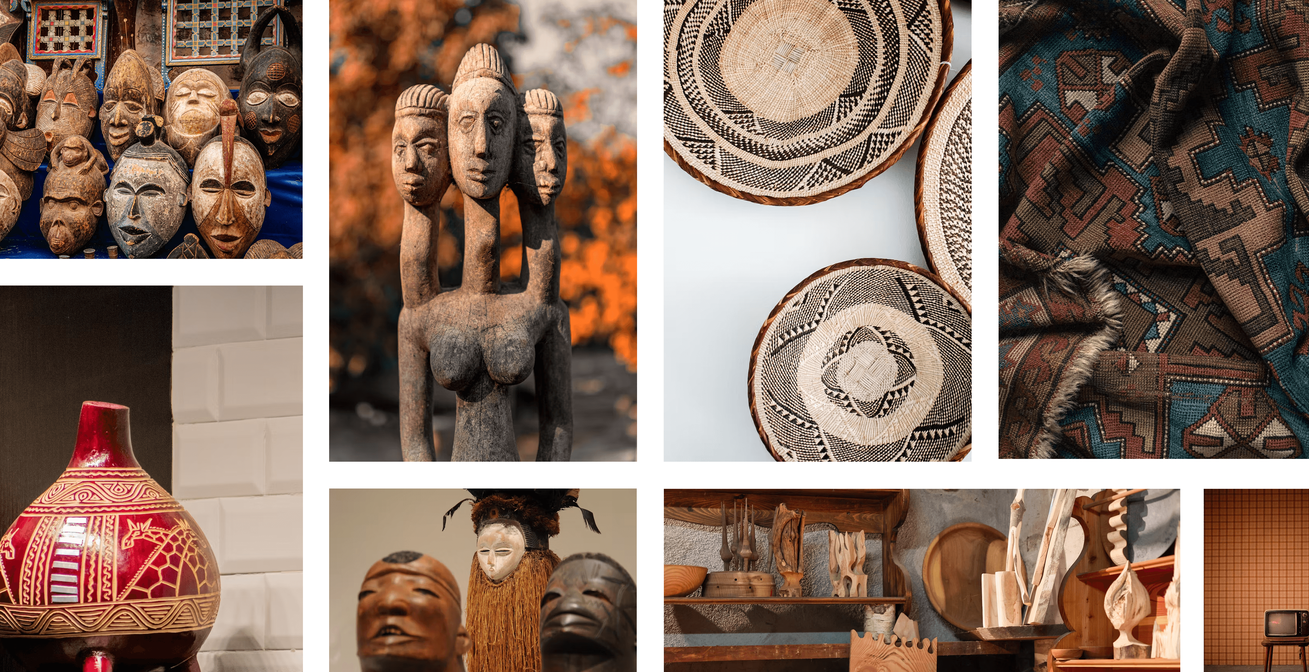 The colour palette was pulled directly from African art — the rich browns, warm oranges, and creamy neutrals that already live in the textures of wooden sculptures, woven baskets, and hand-dyed fabrics. The goal was for the app to feel immediately familiar to users who engage with this kind of art; like the interface itself belongs in the space it's helping you navigate.